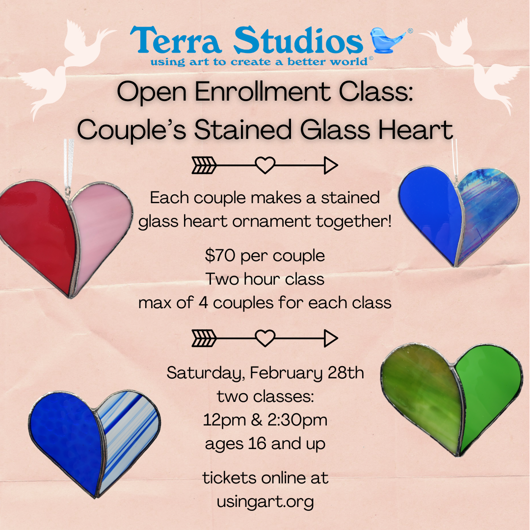 Each couple will work together on one stained glass heart ornament. This class is for ages 16 and older due to handling soldering irons and cutting glass.